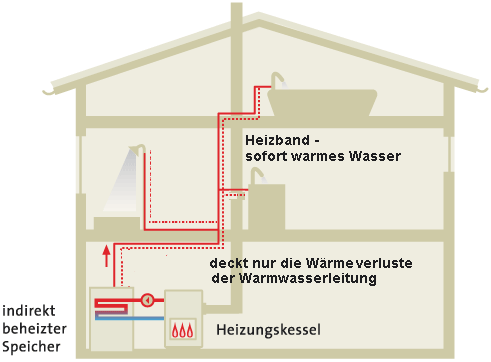 Durch die Anwendung der Warmwasserheizbänder haben Sie stets sofort warmes Wasser an der Zaptstelle zur Verfügung. Damit vermeiden Sie unnötigen Wasserverbrauch bis zum Erreichen der gewünschten Wassertemperatur. Zusätzlich müssen Sie nur die Verluste der Warmwasserleitung decken, die bei einem einfachen Rohr sehr gering sind. Doppelleitungen haben ein größeren Aussendurchmesser (damit höhere Wäremverluste),